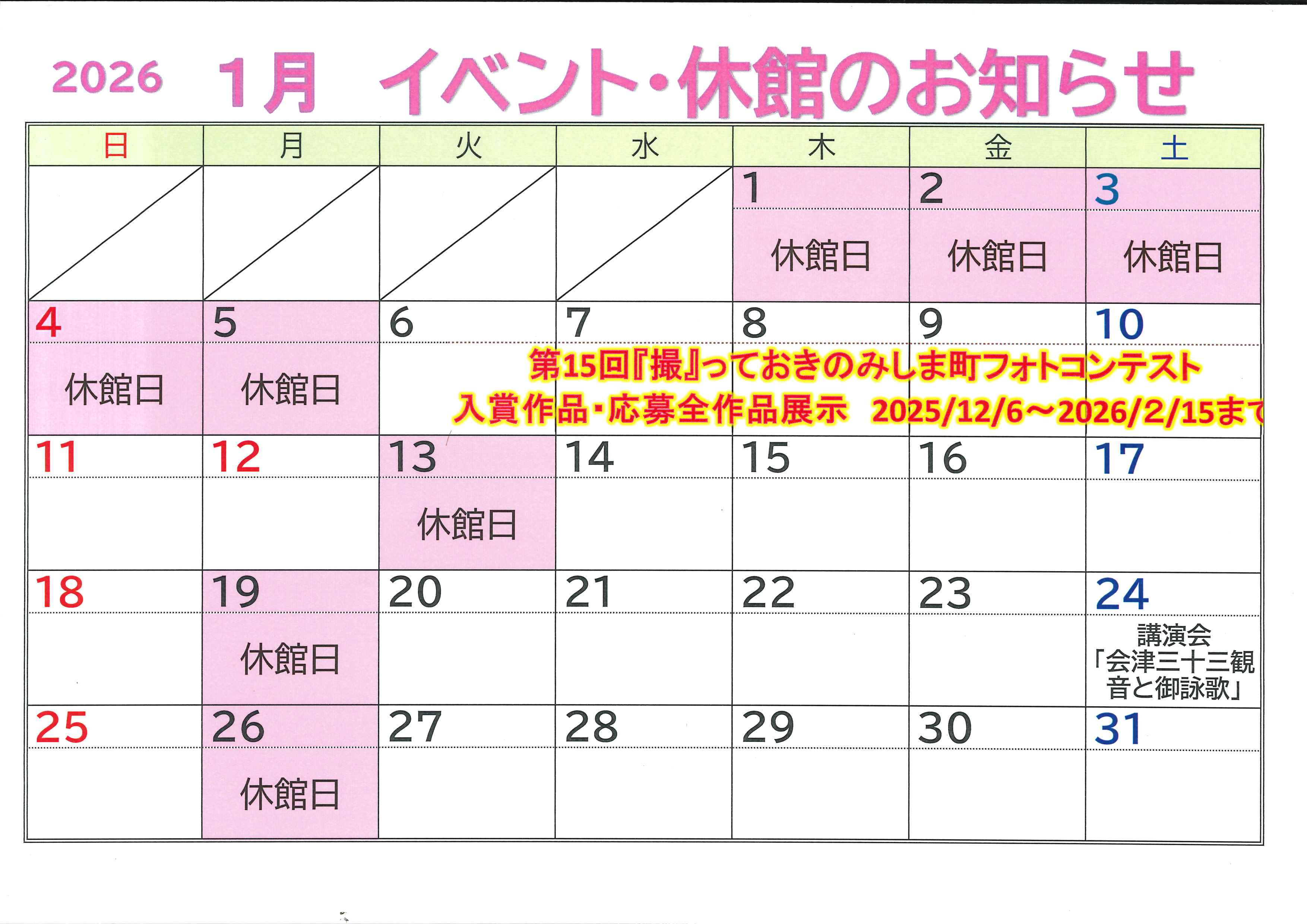 イベント・休館日 令和8年1月のイベント・休館のお知らせ。 〈開館時間〉 9:00~17:00(最終入館16:30) 〈休 館 日〉 毎週月曜日、月曜が祝日の場合、火曜 年末年始 〈入 場 料〉 無料。展示会、展覧会等によっては有料の場合があります。 【お問い合わせ】 三島町交流センター 山びこ 〒969-7402 福島県大沼郡三島町 大字名入字諏訪ノ上418 TEL. 0241-52-2165 FAX. 0241-52-2166 ← 前の記事 一覧